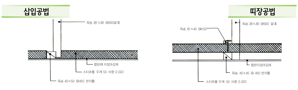 - 소정간격으로 멍에를 배치한다. 이때 밑에 깔린 폴리에칠렌필름이 손상되지 않도록 주의한다. 만일 부주의로 찢어지거나 구멍이 날 경우에는 내습성 테이프로 붙이도록 한다.